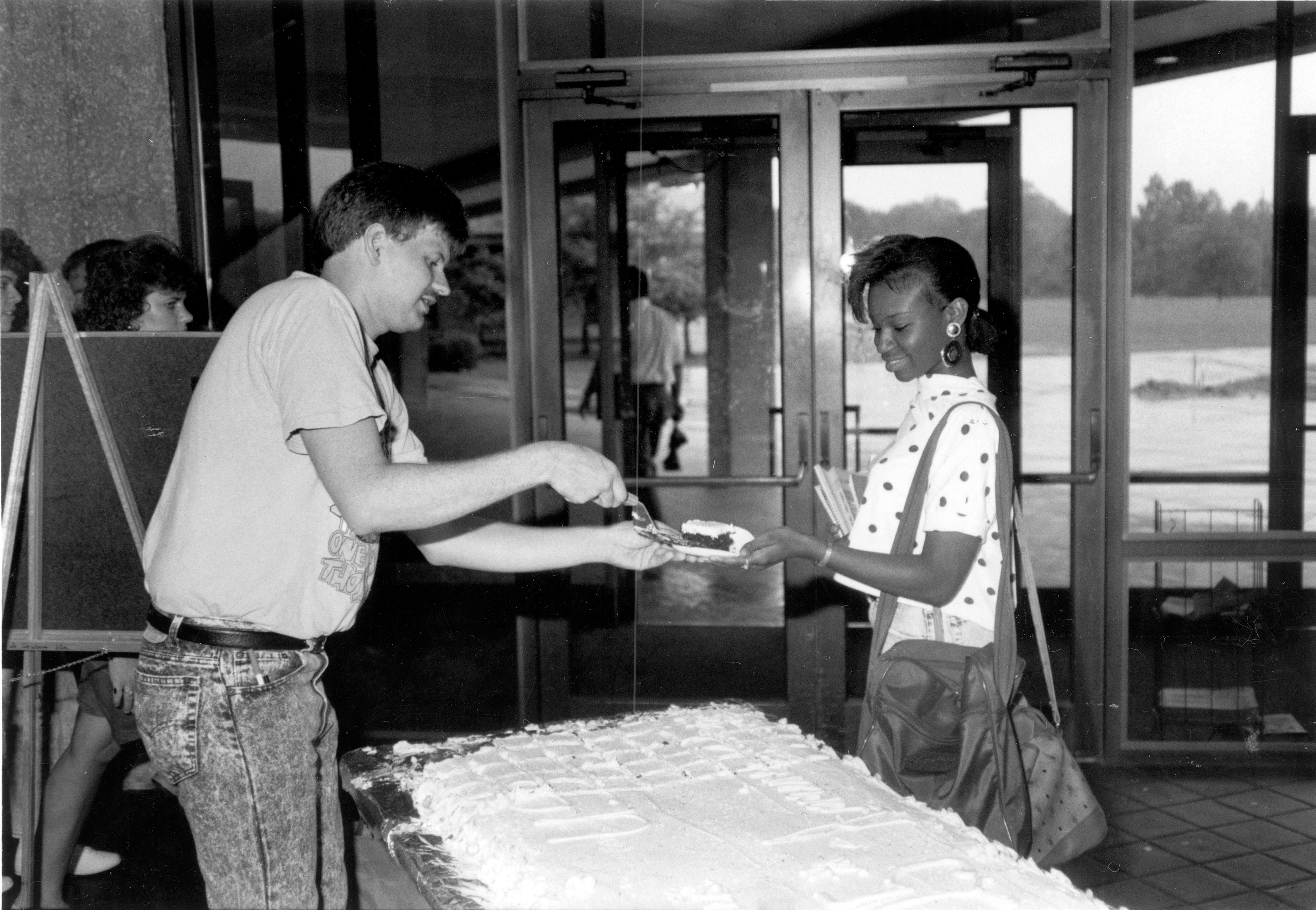 Tracy Rothstein serving cake at USI's 25th anniversary