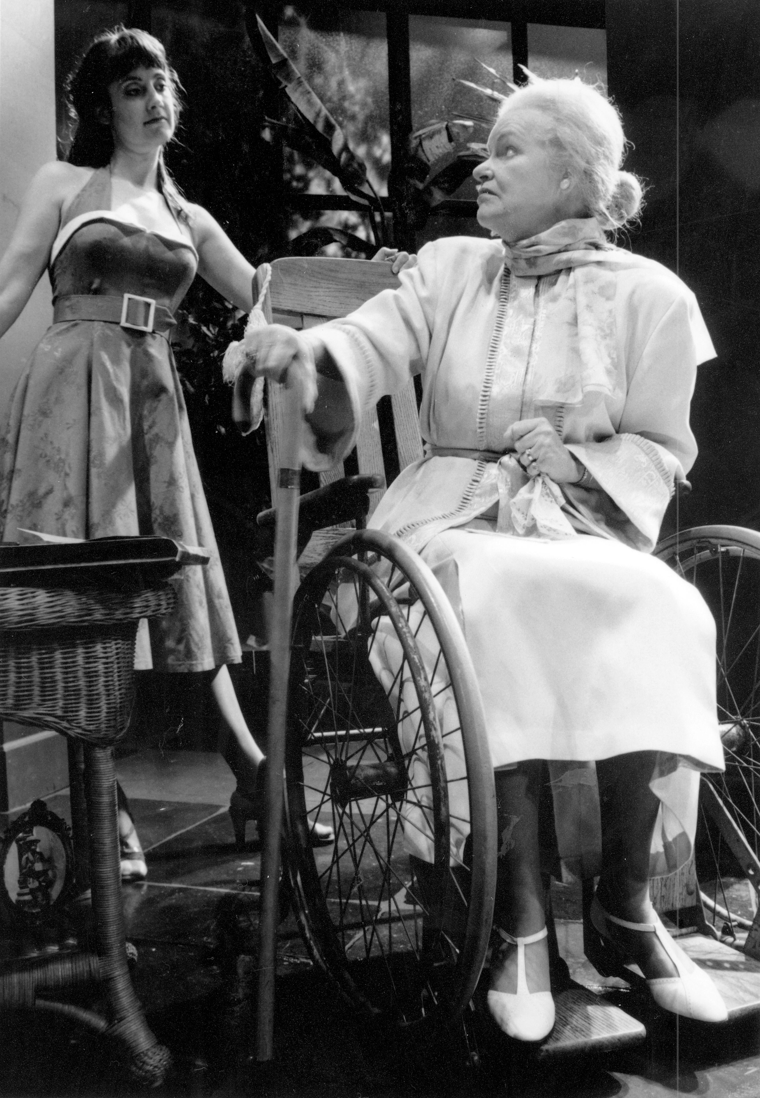 Theater, Scene from play: old woman in wheelchair looking at young woman
