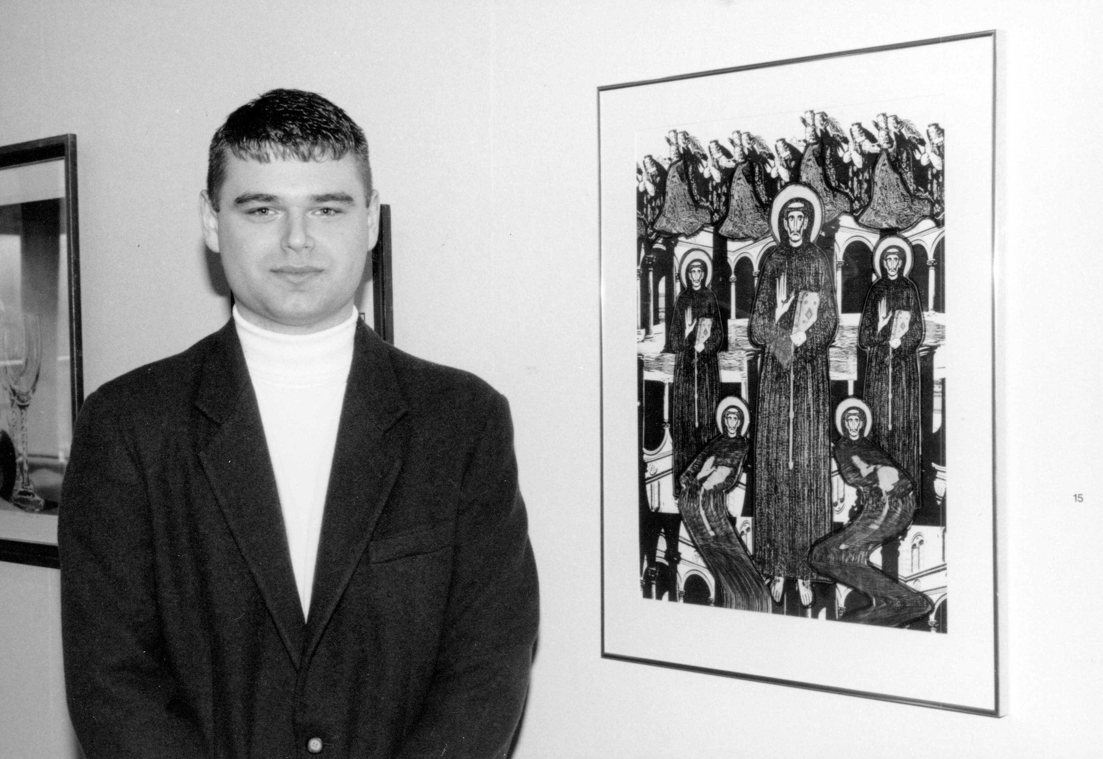 Man next to framed art New Harmony Gallery of Contemporary Art. New Harmony, Indiana